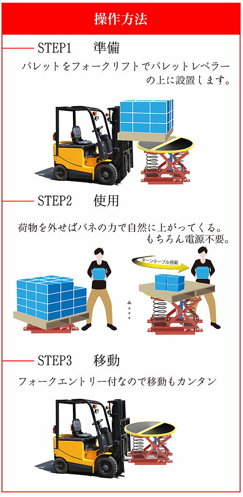 【特長】 ●パレットとフォークリフトを使用するシーンで活躍する腰痛対策機器です。